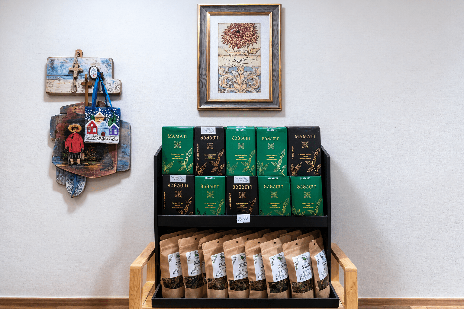 Skhveni is a warm, inviting little café in Kutaisi, designed to showcase the richness of Georgian tea culture. Inside, the atmosphere feels cozy and artisan-crafted: soft lighting, wooden shelves, and displays of local products create a welcoming, home-style charm.